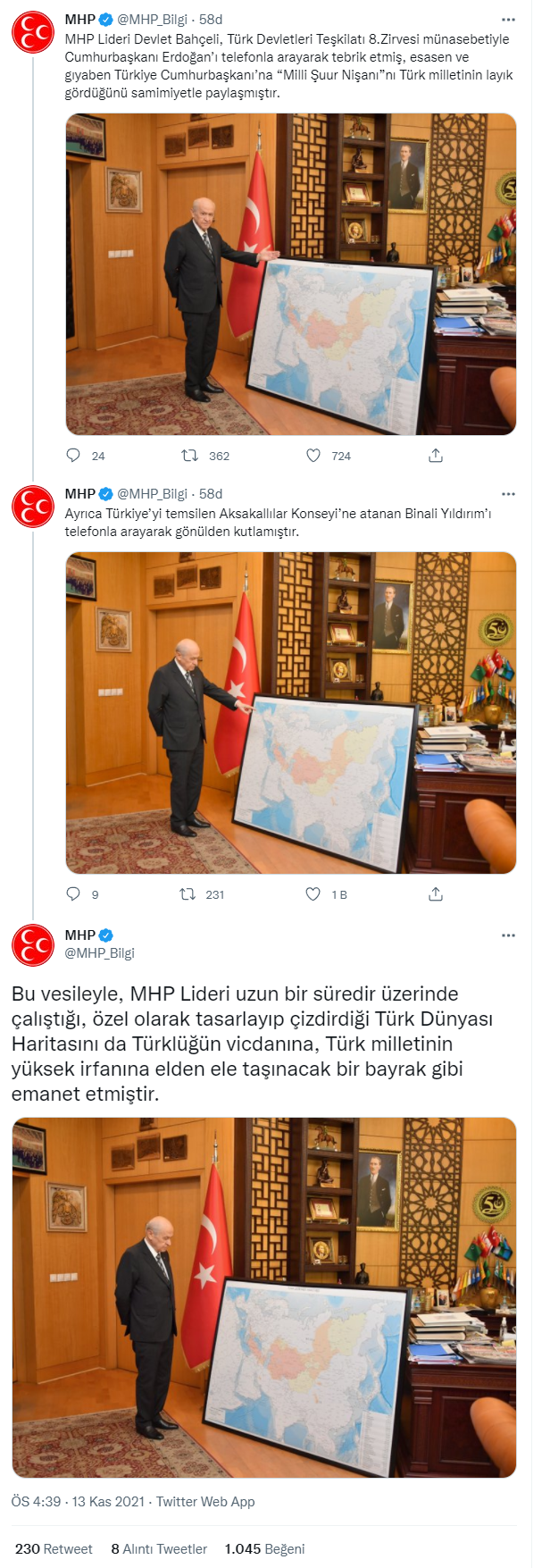 Bu vesileyle, MHP Lideri uzun bir süredir üzerinde çalıştığı, özel olarak tasarlayıp çizdirdiği Türk Dünyası Haritasını da Türklüğün vicdanına, Türk milletinin yüksek irfanına elden ele taşınacak bir bayrak gibi emanet etmiştir.