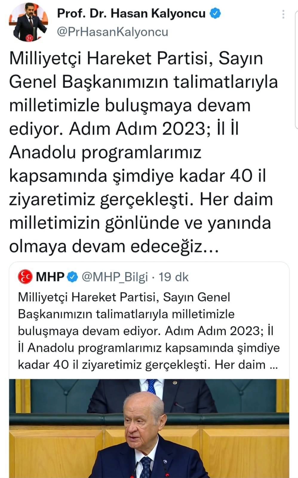 Cumhur İttifakı’nın ortağı Milliyetçi Hareket Partisi (MHP) milletle buluşmaya devam ediyor. Adım “Adım 2023 İl İl Anadolu” programları kapsamında şimdiye kadar 40 il ziyareti gerçekleştirildi.