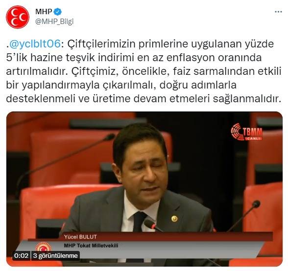 MHP’nin sosyal medya hesabından yapılan paylaşımda, MHP Tokat Milletvekili Yücel Bulut’un konuşmasına yer verilerek çiftçilerin desteklenmesi önerilerine yer verildi.
