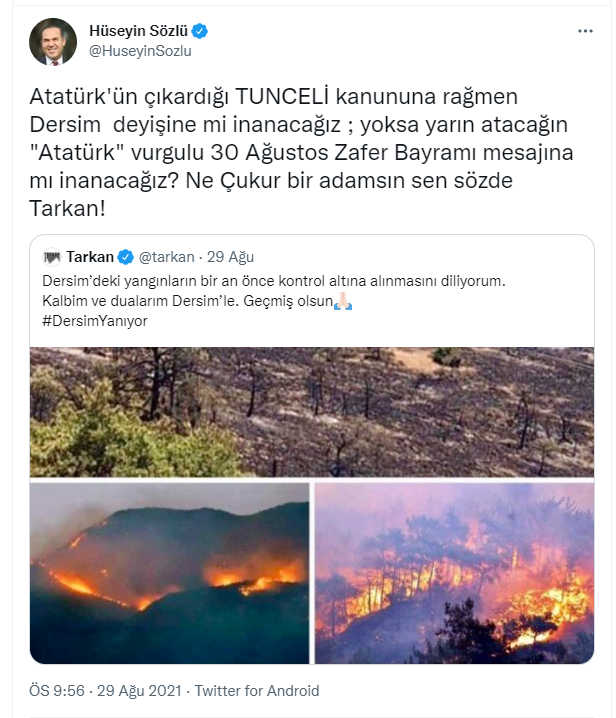 "Atatürk'ün çıkardığı TUNCELİ kanununa rağmen Dersim deyişine mi inanacağız ; yoksa yarın atacağın "Atatürk" vurgulu 30 Ağustos Zafer Bayramı mesajına mı inanacağız? Ne Çukur bir adamsın sen sözde Tarkan!"