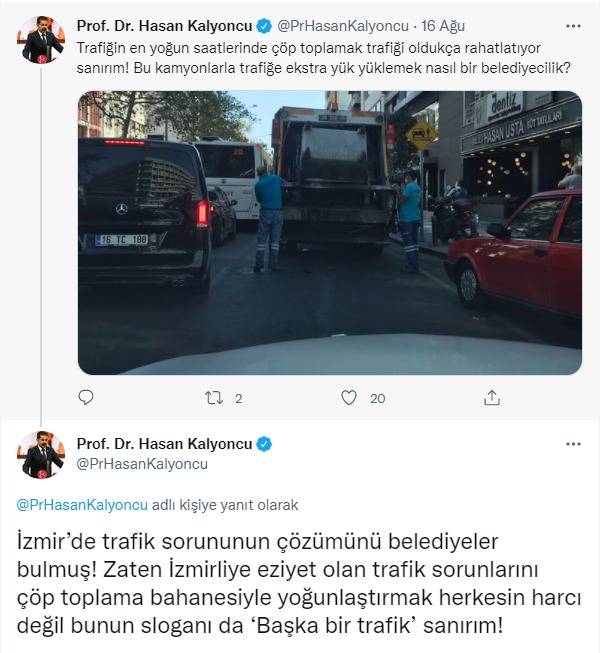Kalyoncu, sosyal medya hesabından yaptığı paylaşımda, “Trafiğin en yoğun saatlerinde çöp toplamak trafiği oldukça rahatlatıyor sanırım! Bu kamyonlarla trafiğe ekstra yük yüklemek nasıl bir belediyecilik? İzmir’de trafik sorununun çözümünü belediyeler bulmuş! Zaten İzmirliye eziyet olan trafik sorunlarını çöp toplama bahanesiyle yoğunlaştırmak herkesin harcı değil bunun sloganı da ‘Başka bir trafik’ sanırım!” ifadelerini kullandı.