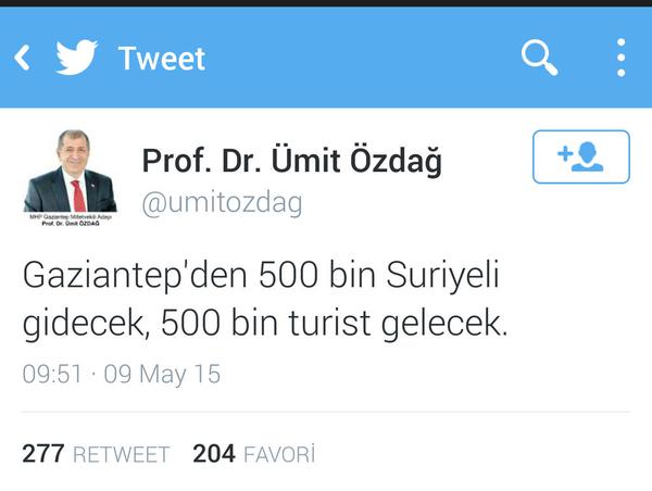 Özdağ Twitter adresinden ''Gaziantep’den 500 bin Suriyeli gidecek, 500 bin turist gelecek'' dedi. Özdağ'ın içlerinde Türkmenlerinde bulunduğu 'Suriyeli sığınmacılar' ile ilgili bu açıklamasına MHP Genel Başkanı Devlet Bahçeli'nin ne cevap vereceği merak konusu.