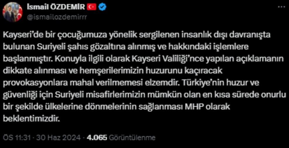 Özdemir, paylaşımında şu sözlere yer verdi: "Kayseri'de bir çocuğumuza yönelik sergilenen insanlık dışı davranışta bulunan Suriyeli şahıs gözaltına alınmış ve hakkındaki işlemlere başlanmıştır. Konuyla ilgili olarak Kayseri Valiliği'nce yapılan açıklamanın dikkate alınması ve hemşerilerimizin huzurunu kaçıracak provokasyonlara mahal verilmemesi elzemdir. Türkiye'nin huzur ve güvenliği için Suriyeli misafirlerimizin mümkün olan en kısa sürede onurlu bir şekilde ülkelerine dönmelerinin sağlanması MHP olarak beklentimizdir."