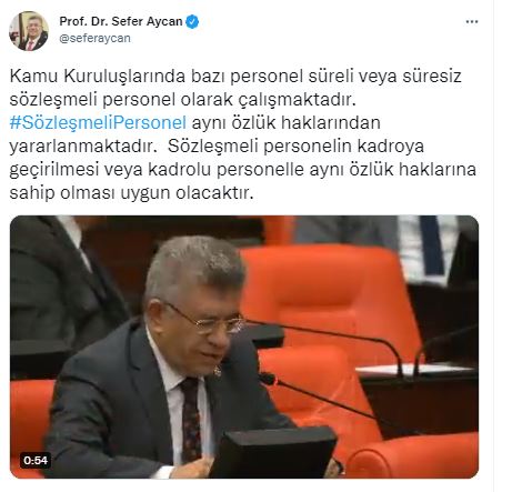 Resmi sosyal medya hesabından paylaşımda bulunan Milliyetçi Hareket Partisi (MHP) Kahramanmaraş Milletvekili Prof. Dr. Sefer Aycan, “ Kamu Kuruluşlarında bazı personel süreli veya süresiz sözleşmeli personel olarak çalışmaktadır. #SözleşmeliPersonel aynı özlük haklarından yararlanmaktadır. Sözleşmeli personelin kadroya geçirilmesi veya kadrolu personelle aynı özlük haklarına sahip olması uygun olacaktır” ifadelerini kullandı.