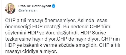 Milliyetçi Hareket Partisi Kahramanmaraş Milletvekili Prof. Dr. Sefer Aycan “CHP altılı masayı önemsemiyor. Aslında esas önemsediği HDP desteği. Bu nedenle CHP tüm söylemini HDP ye göre değiştirdi. HDP Suriye tezkeresine hayır diyor, CHP de hayır diyor. CHP nin HDP ye bakanlık verme sözüde amaçlidir. CHP altılı masayı ciddiye almıyor” ifadelerini kullandı.