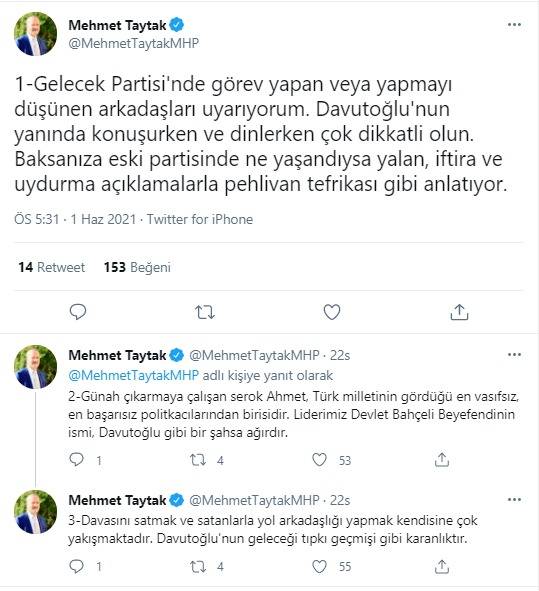 MHP Afyonkarahisar Milletvekili Mehmet Taytak’ın Gelecek Partisi Genel Başkanı Ahmet Davutoğlu’na tepki gösterdiği mesajında, “Gelecek Partisi'nde görev yapan veya yapmayı düşünen arkadaşları uyarıyorum. Davutoğlu'nun yanında konuşurken ve dinlerken çok dikkatli olun. Baksanıza eski partisinde ne yaşandıysa yalan, iftira ve uydurma açıklamalarla pehlivan tefrikası gibi anlatıyor.