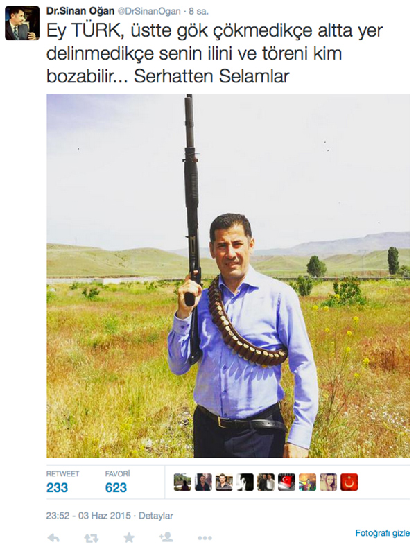 MHP Grup Yönetim Kurulu Üyesi Sinan Oğan, dün gece twitter’dan omuzunda çapraz fişek ve elinde av tüfeğiyle bir fotoğrafını paylaştı. Kırsal bir bölgede olduğu görülen Oğan fotoğrafa yazdığı mesajda “Ey TÜRK, üstte gök çökmedikçe altta yer delinmedikçe senin ilini ve töreni kim bozabilir... Serhatten Selamlar” dedi.