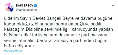 "Liderim Sayın Devlet Bahçeli Bey’e ve davama bugüne kadar olduğu gibi bundan sonra da bağlı ve sadık kalacağım. Disipline sevkimle ilgili kamuoyunda yapılan istismar edici tartışmaların davama ve partime zarar verme ihtimalini bertaraf amacıyla partimden bugün istifa ediyorum."