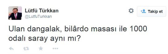 MHP'li Lütfi Türkkan, AK Saray ile Pembe Köşk'ü karşılaştıran ve bilardo masası örneği veren Adalet Bakanı Bekir Bozdağ'a Twitter hesabından "Ulan dangalak, bilârdo masası ile 1000 odalı saray aynı mı?" diye tepki gösterdi.