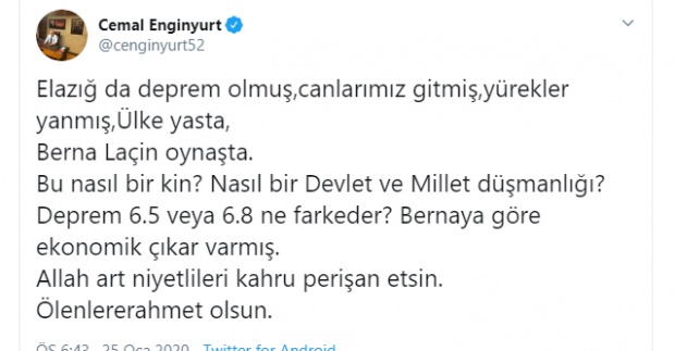 ''Elazığ da deprem olmuş, canlarımız gitmiş, yürekler yanmış, ülke yasta, Berna Laçin oynaşta. Bu nasıl bir kin? Nasıl bir Devlet ve Millet düşmanlığı? Deprem 6.5 veya 6.8 ne farkeder? Bernaya göre ekonomik çıkar varmış. Allah art niyetlileri kahru perişan etsin. Ölenlererahmet olsun.''