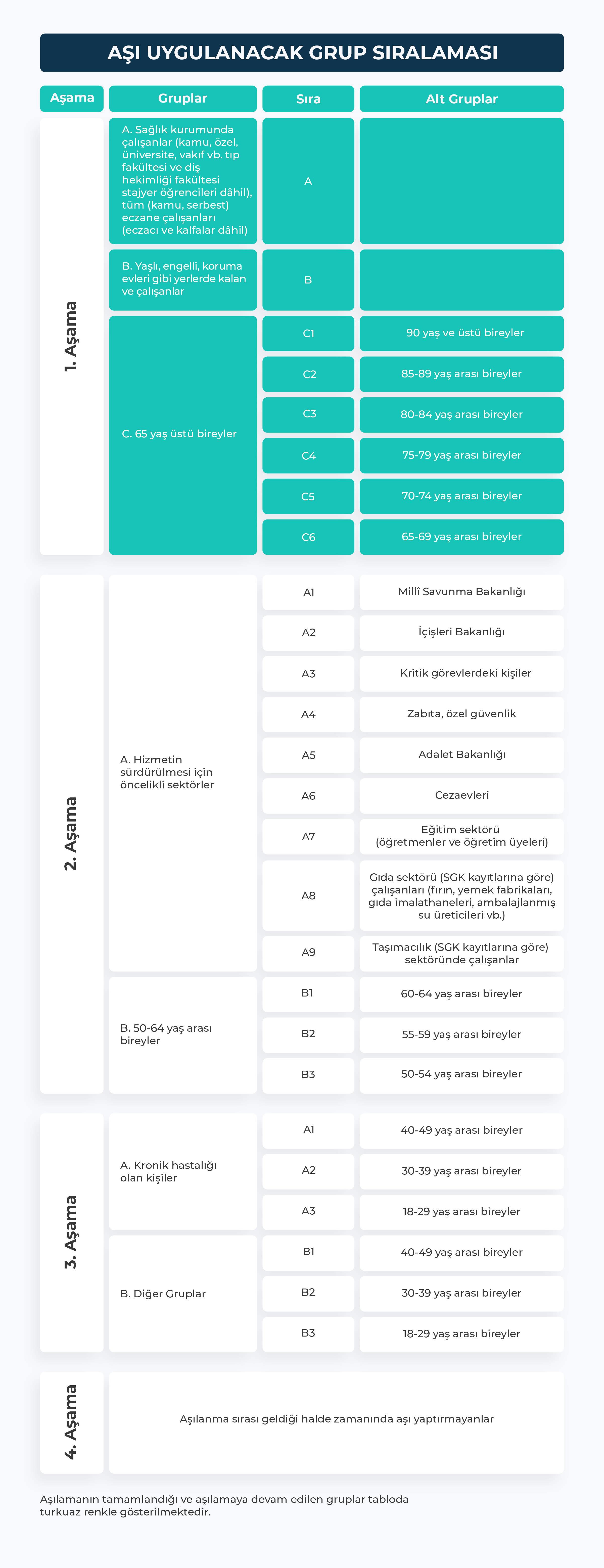 Koronavirüs aşısı için Merkezi Hekim Randevu Sistemi (MHRS) üzerinden https://www.mhrs.gov.tr/ veya 182'den randevu alınarak başvurulabilecek. Vatandaşlar, öncelik gruplarına göre kendilerine ulaşan bildirimden sonra, Merkezi Hekim Randevu Sistemi (MHRS) üzerinden aile hekimlerinden veya uygun kamu hastanesi ya da özel hastaneden randevu alarak aşılarını yaptırabilecek. Vatandaşlar, Covid-19 risk sıralamasını e-Nabız sitesinden görebilecek. Aşılar 28 gün ara ile 2 doz olarak uygulanacak.