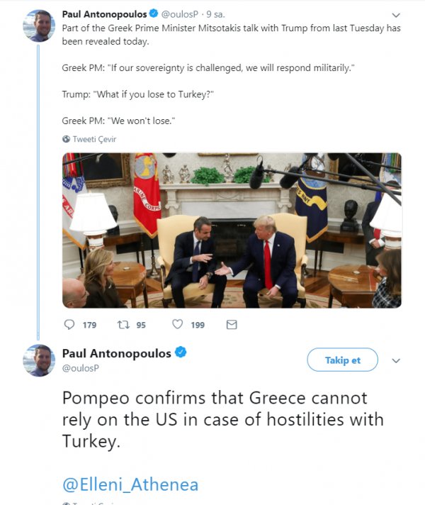 ABD Dışişleri Bakanı Mike Pompeo'nun da Yunanistan'a, Türkiye ile aralarında oluşabilecek bir gerilimde ABD'ye güvenmemeleri gerektiği uyarısında bulunduğu bilgisi paylaşıldı.