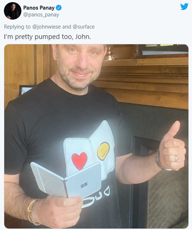 Teknoloji sektörünün başat gücü olmayı hedefleyen Microsoft yeni cihazını tanıtmak için gün sayıyor. Daha öncesinde sosyal medyaya yansıyan yeni cihazınlarının görüntüleri kullanıcılara " yakın bir zamanda çıkacak" dedirtmişti. Yanlız halen piyasaya sürülmemiş olan cihazdan bomba bir görüntü geldi. Microsoft Surface Duo Panos Panay'ın elinde görüntülendi.Şirket henüz resmi donanım özelliklerini paylaşmamış olsa da, sızıntılar bir Qualcomm Snapdragon 855 işlemci, 6GB RAM, 256GB'a kadar depolama alanı ve iki adet katlanabilen 5,6 inç ekran ile kullanıcılarının karşısına çıkacağı iddia ediliyor. Cihazın piyasaya ne zaman çıkacağı merak konusu olmaya devam etsede, çok yakın zamanda vitrinlerde bulacağımız kesin.