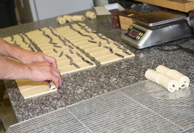 Kare kesilmiş ve yumuşamış milföyleri ortadan ikiye kesin. İçerisine çikolata kreması sürün ve yuvarlayın. Diğer hamurlar içinde aynı işlemi uygulayın. 180 derecelik önceden ısıtılmış fırına verin ve pişirmeye bırakın. Üzeri pembeleşince fırından alabilirsiniz.