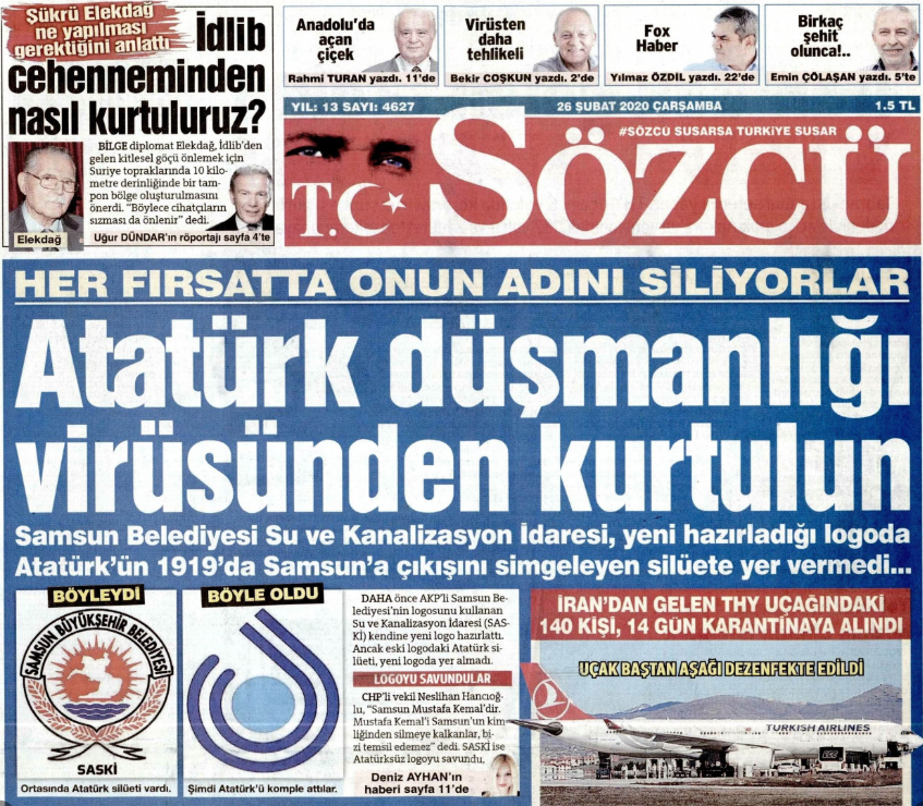 Samsun Büyükşehir Belediyesi’ne bağlı Samsun Su ve Kanalizasyon İdaresi Genel Müdürlüğü’nün yenilenen logosunda Atatürk silueti yer almadığı için ortalığı ayağa kaldırmaya çalışan Sözcü, konu M.Kemal üzerinden prim yapmak olunca, gündemdeki en önemli gelişmeleri bile es geçiyor.