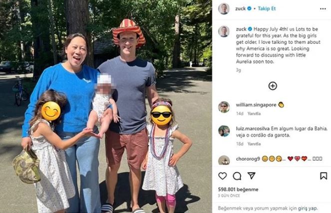 Facebook'un kurucusu, Meta CEO'su Mark Zuckerberg'in 4 Temmuz günü Instagram hesabından ailesiyle çekildiği fotoğrafı paylaştı. Zuckerberg, paylaşımına, "Mutlu 4 Temmuzlar! Bu yıl için minnettar olacağımız çok şey var. Büyük kızlar büyüdükçe, onlarla Amerika'nın neden bu kadar harika olduğu hakkında konuşmayı seviyorum. Yakında küçük Aurelia ile de konuşmayı dört gözle bekliyorum." notunu düştü. Mark Zuckerberg'in fotoğrafta Aurelia, Maxima ve August'un isimli 3 kız çocuğunun yüzünü emojilerle gizlemesi dikkatlerden kaçmadı.