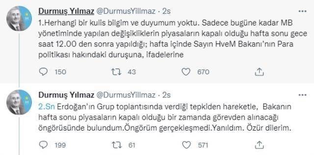 Herhangi bir kulis bilgim ve duyumum yoktu. Sadece bugüne kadar Merkez Bankası yönetiminde yapılan değişikliklerin piyasaların kapalı olduğu hafta sonu gece saat 12.00'den sonra yapıldığı; hafta içinde sayın Hazine ve Maliye Bakanı'nın para politikası hakkındaki duruşuna, ifadelerine, sayın Erdoğan'ın grup toplantısında verdiği tepkiden hareketle Bakan'ın hafta sonu piyasaların kapalı olduğu bir zamanda görevden alınacağı öngörüsünde bulundum. Öngörüm gerçekleşmedi. Yanıldım. Özür dilerim.
