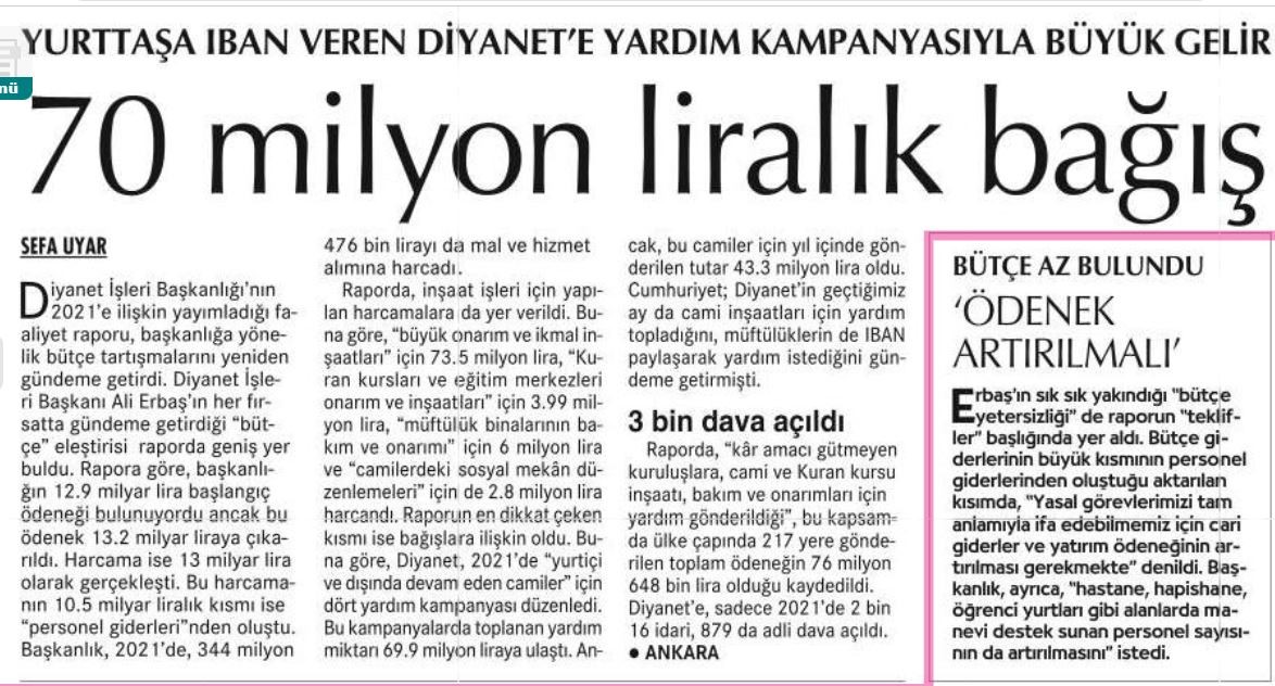 Ayrıca haberde, “Raporda, “kâr amacı gütmeyen kuruluşlara, cami ve Kuran kursu inşaatı, bakım ve onarımları için yardım gönderildiği”, bu kapsamda ülke çapında 217 yere gönderilen toplam ödeneğin 76 milyon 648 bin lira olduğu kaydedildi. Diyanet’e, sadece 2021’de 2 bin 16 idari, 879 da adli dava açıldı.” denilerek, Kur’an kurslarına yapılan harcamalardan rahatsız oldukları da dile getirildi.