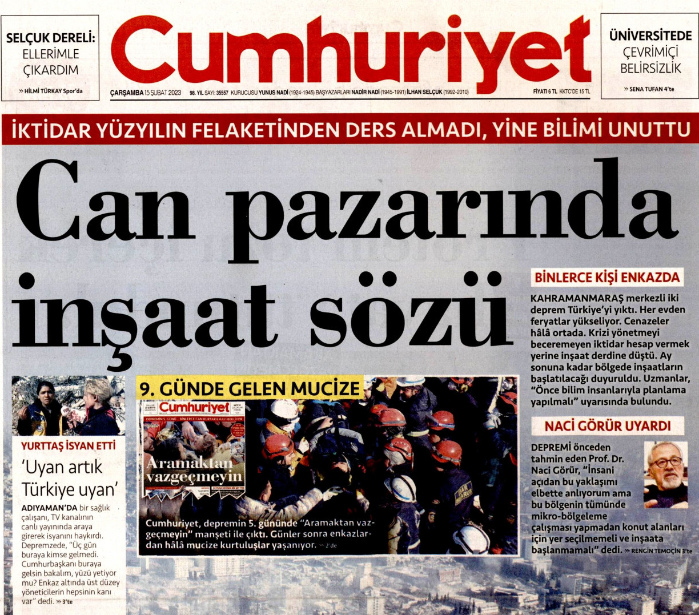 Gazete, "Can pazarında inşaat sözü" ifadelerini kullandığı haberinde, adeta depremzede vatandaşların sokakta kalmalarını ister gibi Cumhurbaşkanı Erdoğan'ın sözünü hedef aldı.