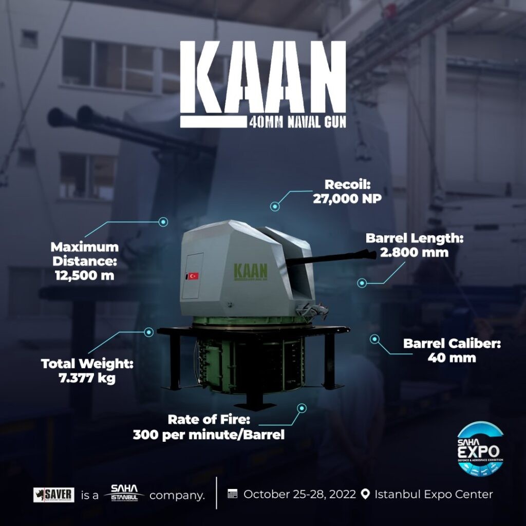 "SAVER Savunma" tarafından geliştirilen 40mm çift namlulu top Kaan, 25-28 Ekimde yapılacak olan SAHA EXPO’da tanıtılacak.