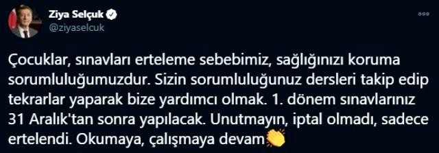 Bakan, özellikle sınav sistemi ile ilgili karışıklığı gidermek için yaptığı paylaşımda şu ifadelere yer verdi: "Çocuklar, sınavları erteleme sebebimiz, sağlığınızı koruma sorumluluğumuzdur. Sizin sorumluluğunuz dersleri takip edip tekrarlar yaparak bize yardımcı olmak. 1. dönem sınavlarınız 31 Aralık'tan sonra yapılacak. Unutmayın, iptal olmadı, sadece ertelendi. Okumaya, çalışmaya devam"