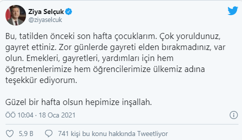 Selçuk, "Bu, tatilden önceki son hafta çocuklarım. Çok yoruldunuz, gayret ettiniz. Zor günlerde gayreti elden bırakmadınız, var olun. Emekleri, gayretleri, yardımları için hem öğretmenlerimize hem öğrencilerimize ülkemiz adına teşekkür ediyorum.Güzel bir hafta olsun hepimize inşallah." açıklamasında bulundu.