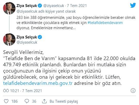 Milli Eğitim Bakan Ziya Selçuk, telafi eğitime başlanmasının ardından katılım süreci ile ilgili bilgilendirmelerde bulunarak velilere de çağrıda bulundu.