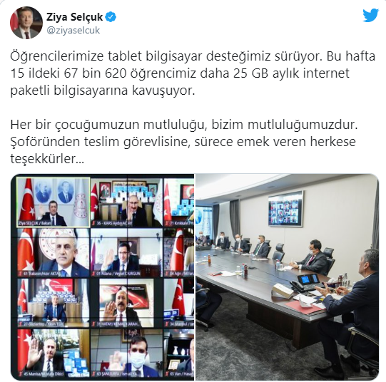 Bakan Selçuk, Twitter'dan yaptığı açıklamada, "Öğrencilerimize tablet bilgisayar desteğimiz sürüyor.