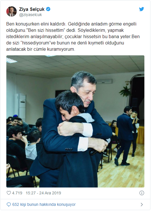 Bakan Selçuk, burada yaptığı konuşma sırasında görme engelli bir öğrenciyle arasında geçen duygu dolu bir diyaloğu kişisel sosyal medya hesabından paylaştı.