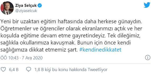 Milli Eğitim Bakanı Ziya Selçuk, sosyal medya hesabından açıklamada bulundu. Yine uyarıda bulunan Selçuk, "Yeni bir uzaktan eğitim haftasında daha herkese günaydın. Öğretmenler ve öğrenciler olarak ekranlarımızı açtık ve her koşulda eğitime devam etme gayretindeyiz. Tek dileğimiz, sağlıkla okullarımıza kavuşmak. Bunun için önce kendi sağlığımıza dikkat etmemiz şart. " dedi.