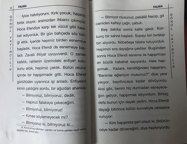 Hasan Aydın isimli kullanıcı, 8 yaşındaki oğluna öğretmeninin tavsiyesiyle Ömer Seyfettin’in kitaplarının aldığını, çocuğun Falaka ve Bomba isimli kitaplarda sorun olduğunu fark ettiğini söyledi. Aydın, Falaka’da din hocasının bayıltana kadar çocuk dövdüğünü, Bomba’da ise Akit’in de dikkat çektiği müstehcen ifadelerin yer aldığını vurguladı.