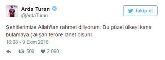 Barcelonalı futbolcu Arda Turan, Şemdinli'de yaşanan hain saldırı sonrası sosyal medya üzerinden teröre tepki gösterdi.