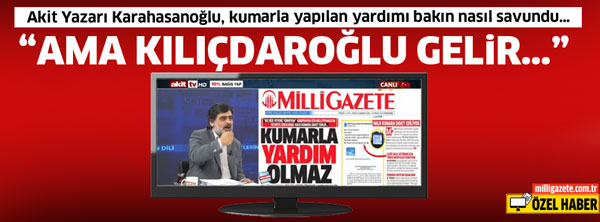 Söz konusu programda, Milli Gazete’nin attığı manşetin doğruluğu ve haklılığını teslim etmek yerine kumarla yapılacak yardıma çanak tutulması bu kadarına da pes dedirtti. Ali İhsan Karahasanoğlu programda, Milli Gazete’nin manşetini ‘Erdoğan giderse Kılıçdaroğlu gelecek. O zaman bunları yazamazsınız.’ gibi basit ve hiçbir dayanağı olmayan sözlerle eleştirmeye kalkıştı.”