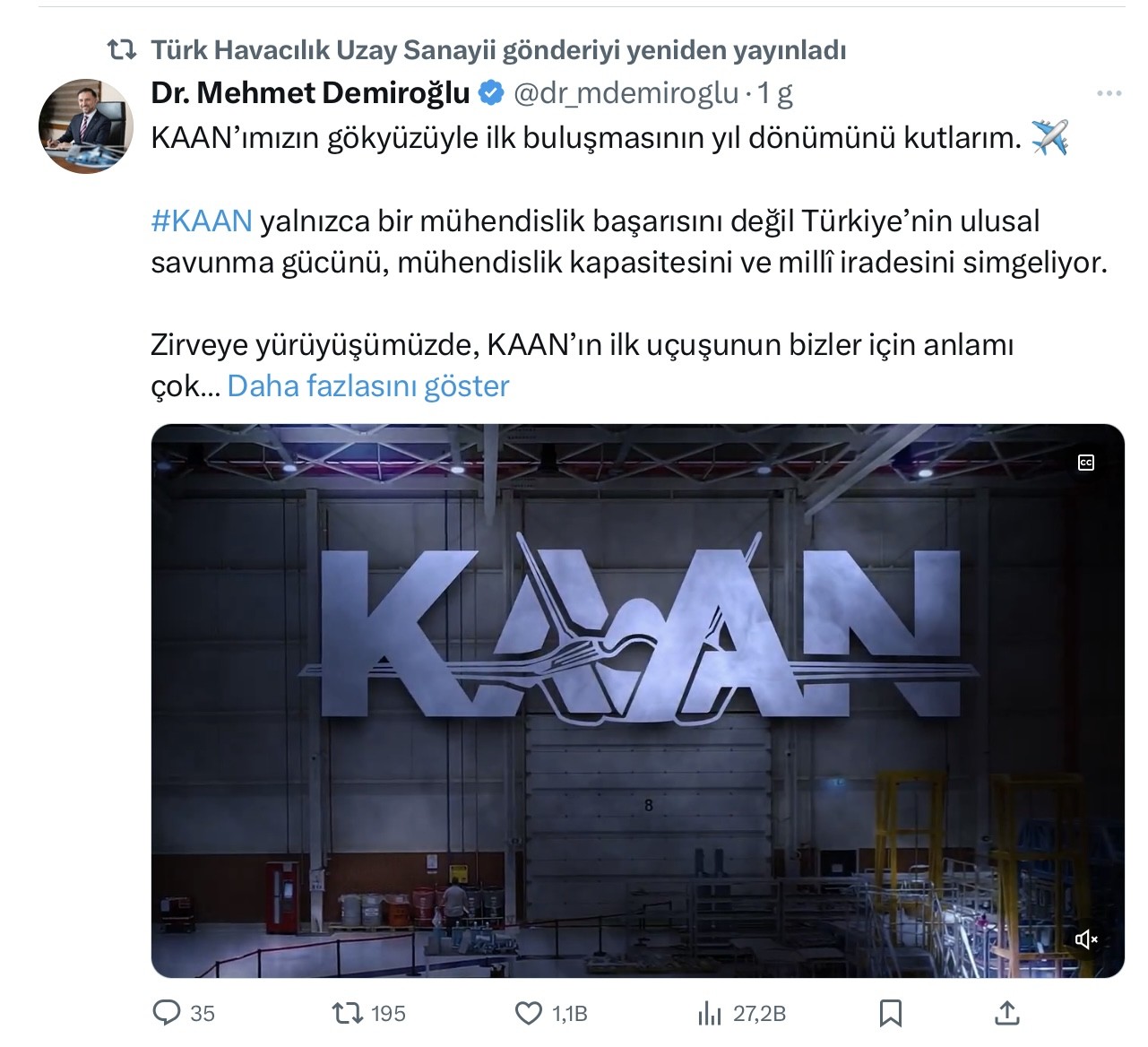 TUSAŞ Genel Müdürü Mehmet Demiroğlu ise, “KAAN’ımızın gökyüzüyle ilk buluşmasının yıl dönümünü kutlarım. KAAN yalnızca bir mühendislik başarısını değil Türkiye’nin ulusal savunma gücünü, mühendislik kapasitesini ve millî iradesini simgeliyor.
