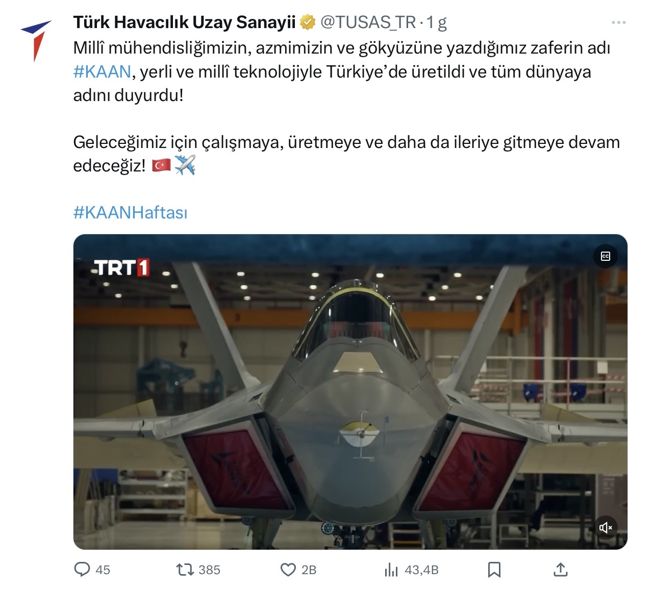 Projenin ana yüklenicisi TUSAŞ, "Geleceğimiz için çalışmaya, üretmeye ve daha da ileriye gitmeye devam edeceğiz!" mesajını paylaştı.