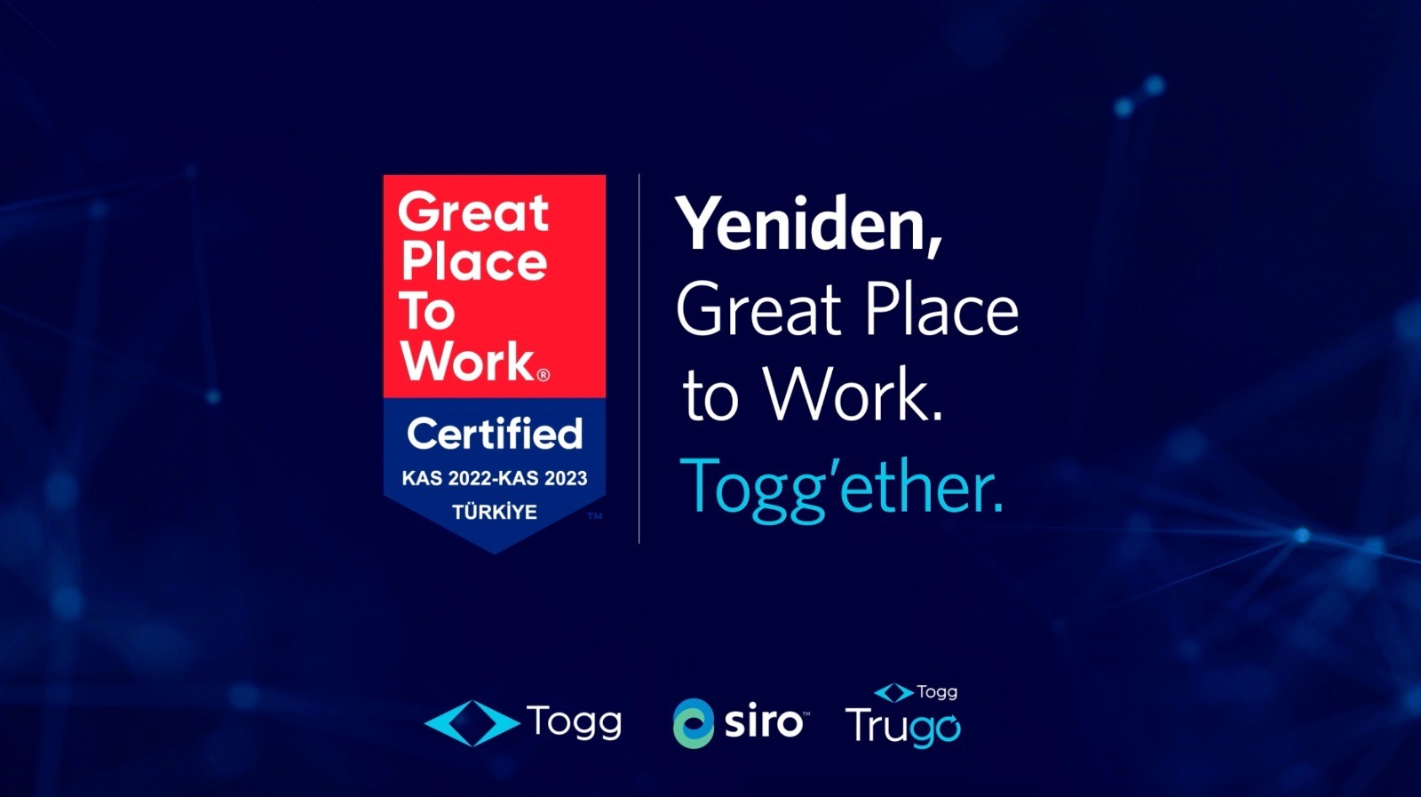 Togg, grup şirketleri Siro ve Trugo birlikte, kurum kültürü konusunda küresel ve bağımsız bir otorite olan Great Place to Work Enstitüsü’nün düzenlediği çalışan deneyimi araştırmasında, kendi çalışanlarının yaptığı değerlendirmeler sonucunda ‘Great Place to Work’ sertifikasını üst üste ikinci kez almaya hak kazandı.