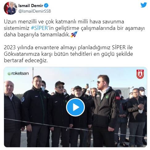 Savunma Sanayii Başkanı İsmail Demir, Twitter hesabından yaptığı paylaşımda, "Uzun menzilli ve çok katmanlı milli hava savunma sistemimiz Siper'in geliştirme çalışmalarında bir aşamayı daha başarıyla tamamladık. 2023 yılında envantere almayı planladığımız Siper ile Gökvatanımıza karşı bütün tehditleri en güçlü şekilde bertaraf edeceğiz" ifadelerini kullandı.