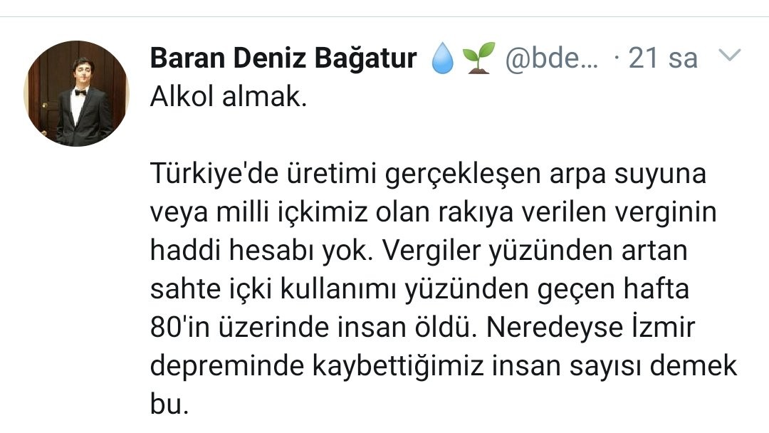 Ali Babacan tarafından kurulan DEVA Partisi’nin 90 kişilik kurucular kurulu üyesinde bulunan Baran Deniz Bağatur, sosyal medya hesabından Müslüman bir ülkede söylenmeyecek skandal sözler sarf etti. Alkole koyulan vergileri eleştirerek vergiler yüzünden sahte alkol kullanımının arttığını söyleyen Bağatur, Türklerin milli içkisinin rakı olduğunu belirtti.