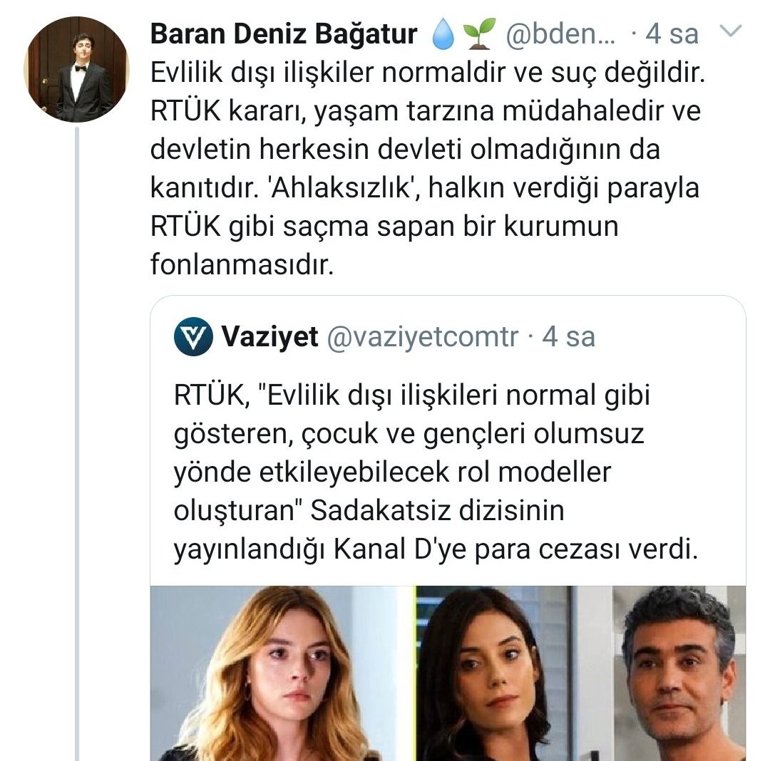 Skandallarını bununla da bitirmeyen Bağatur, İslam dininde zina olarak adlandırlan ve en büyük günahlardan biri olan evlilik dışı ilişkilerin ise normal olduğunu söyledi. Kanal D'de yayınlanan rezil dizi 'Sadakatsiz'e RTÜK'ün verdiği cezayı eleştiren Bağatur, bu durumun yaşam tarzına müdahale olduğunu söyledi. Dizideki ahlaksız sahnelerin gençlere kötü örnek olduğunu görmezden gelen Bağatur, asıl 'Ahlaksızlığın' gençlerimize kötü örnek olan yayınlara müdahale eden RTÜK'ün devlet tarafından fonlanması olduğunu ifade etti.