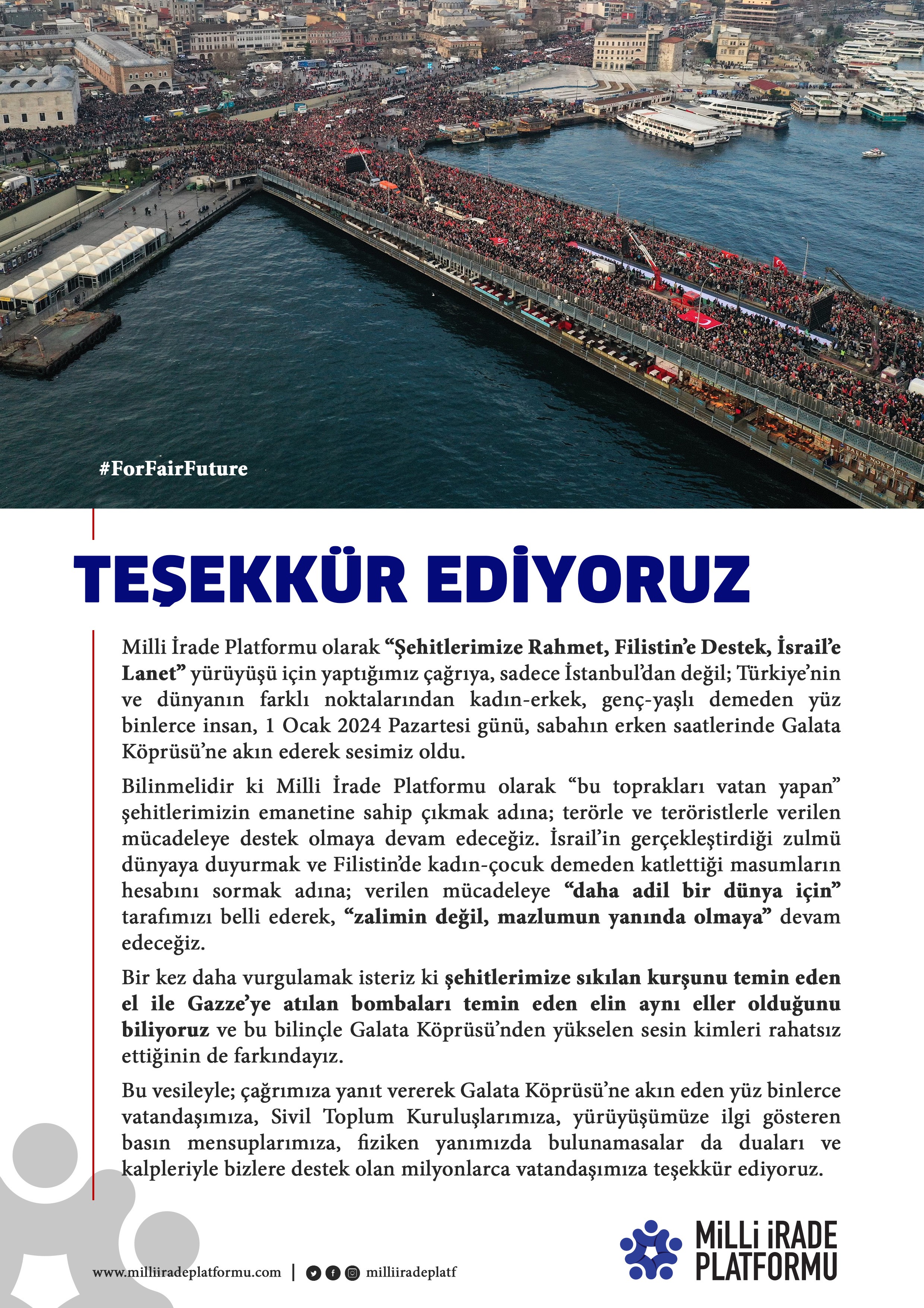 Milli İrade Platformu sosyal medya hesabından yayınladığı mesajda Galata Köprüsü'ndeki Filistin eylemine katılan vatandaşlara teşekkür etti.