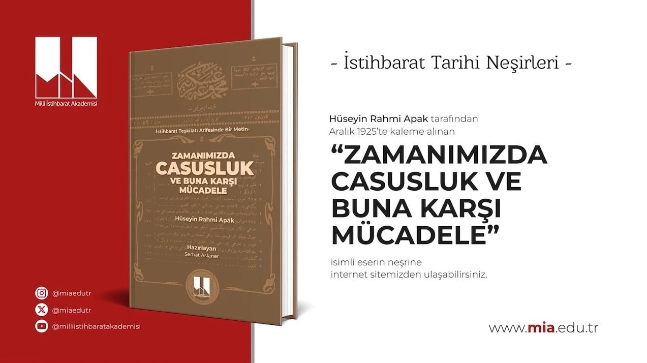 Milli İstihbarat Akademisi (MİA), Türk istihbarat tarihine yeni bir katkı daha sundu. Hüseyin Rahmi Apak tarafından Aralık 1925'te yayımlanan "Zamanımızda Casusluk ve Buna Karşı Mücadele" başlıklı çalışma 100 yıl sonra yeniden yayımlandı.