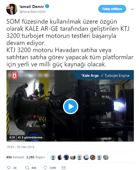 Savunma Sanayii Müsteşarı (SSM) İsamail Demir, resmi sosyal medya hesaplarından verdiği bilgide, "SOM füzesinde kullanılmak üzere özgün olarak KALE AR-GE tarafından geliştirilen KTJ 3200 turbojet motorun testleri başarıyla devam ediyor.