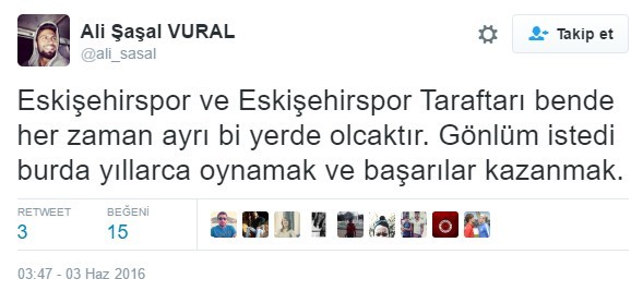 "Bugün 2 yıl önce geldiğim ve hayatımda bana çok şeyler katan Eskişehirspor ile olan sözleşmemi fesih etmiş bulunmaktayım. Hayırlısı olsun. Eskişehirspor ve Eskişehirspor taraftarı, bende her zaman ayrı bir yerde olacaktır. Gönlüm istedi burada yıllarca oynamak ve başarılar kazanmak. Çok sevdiğim Eskişehirspor'a başarılar dilerim."
