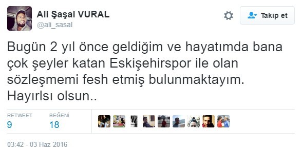 Alacakları için daha önce Türkiye Futbol Federasyonu'na başvuran kaleci Ali Şaşal Vural, Twitter hesabından Eskişehirspor ile 31 Mayıs 2018'e kadar sözleşmesini tek taraflı olarak sözleşmesini feshettiğini açıklarken şöyle dedi: