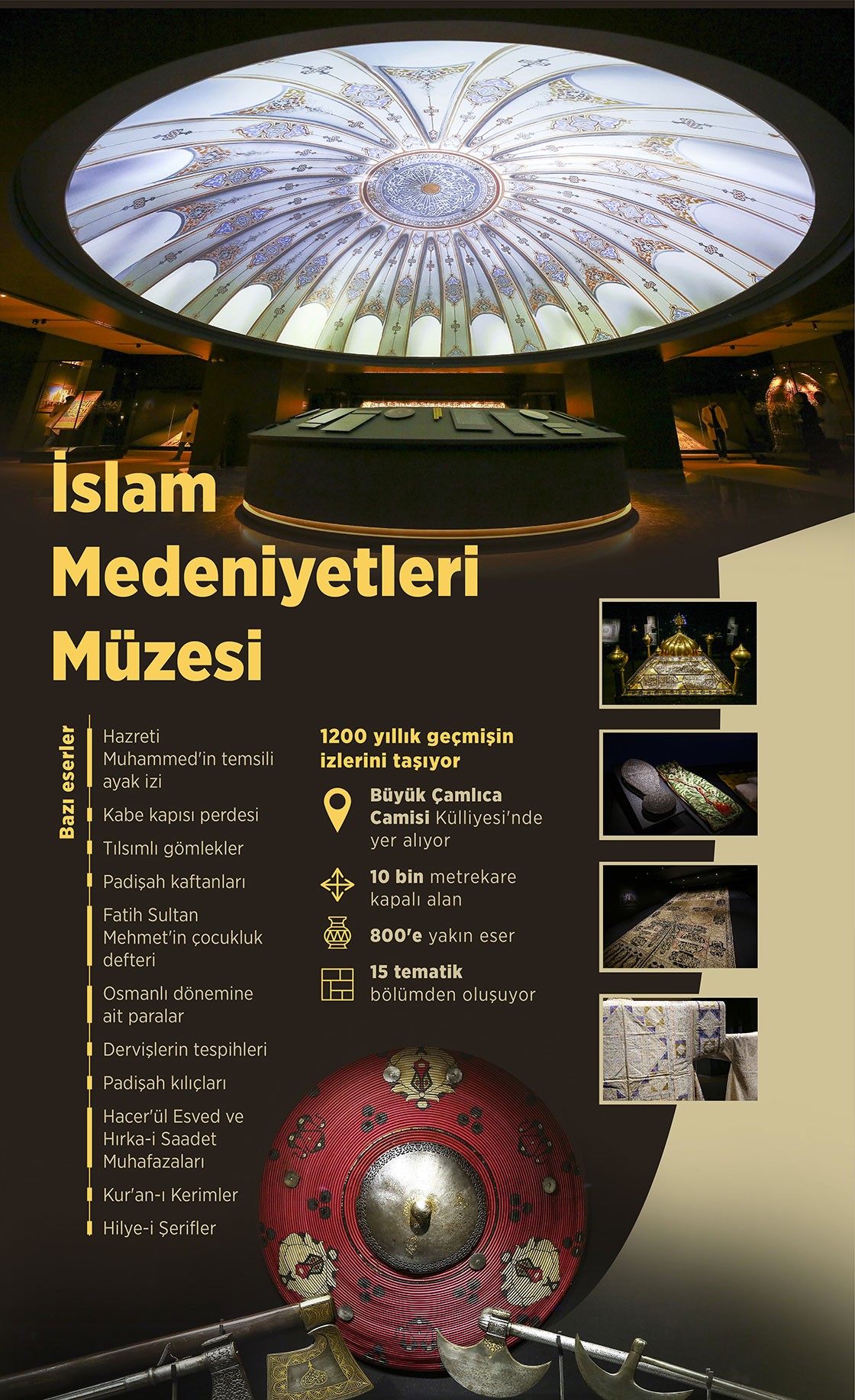 İslam Medeniyetleri Müzesi, 1200 yıllık geçmişin izlerini taşıyan ve pek çoğu daha önce teşhir edilmemiş eşsiz eserleri barındırıyor. Osmanlı Devleti'nin her sene hac mevsiminden önce Mekke ve Medine'ye gönderdiği Surre-i Hümayun Alayı'nın en gösterişli unsuru olan Mahmel-i Şerif ile Peygamber Hz. Muhammed'in fiziki ve ahlaki güzelliklerini anlatan Hilye-i Şerifler, koleksiyonun dikkati çeken eserleri arasında yer alıyor. Bu iki eserin yanı sıra müzede Hücre-i Saadet perdesi, Başmak-ı Şerif, Sakal-ı Şerif, Hilye-i Şerif, Kabe örtüleri, Kur'an-ı Kerimler, Hacer'ül Esved ve Hırka-i Saadet mahfazaları, Kabe kilidi ve anahtarı, kaftanlar ve tılsımlı gömlekler, sikkeler ve çini sanatının nadide örnekleri de bulunuyor.