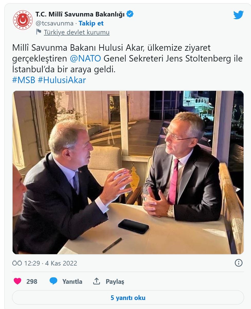 Milli Savunma Bakanlığı Twitter hesabından Milli Savunma Bakanı Hulusi Akar, NATO Genel Sekreteri Jens Stoltenberg'in İstanbul'da bir araya geldiklerini duyurdu.