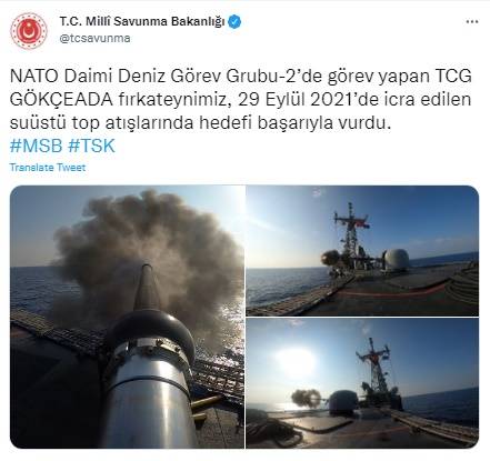 MSB'nin sosyal medya hesabından yapılan açıklamada, "NATO Daimi Deniz Görev Grubu-2'de görev yapan TCG GÖKÇEADA fırkateynimiz, 29 Eylül 2021'de icra edilen su üstü top atışlarında hedefi başarıyla vurdu" denildi.
