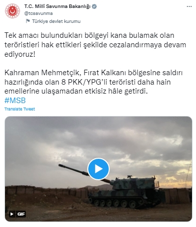 "Tek amacı bulundukları bölgeyi kana bulamak olan teröristleri hak ettikleri şekilde cezalandırmaya devam ediyoruz! Kahraman Mehmetçik, Fırat Kalkanı bölgesine saldırı hazırlığında olan 8 PKK/YPG’li teröristi daha hain emellerine ulaşamadan etkisiz hâle getirdi."