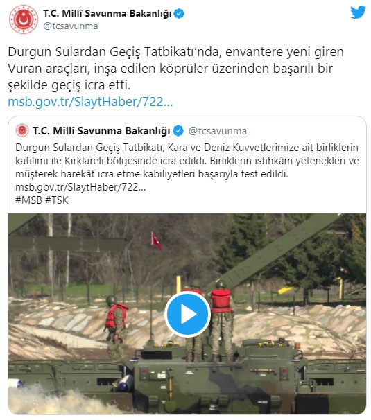 Bakanlıktan yapılan yazılı açıklamada, "Deniz Kuvvetleri Komutanlığı unsurları, zırhlı/mekanize birlikler ile istihkâm birliklerinin yakın iş birliği içerisinde Nehir Geçiş Harekâtı esaslarına göre icra edilen tatbikatta; tanklar su tabanına basarak, Geliştirilmiş Zırhlı Personel Taşıyıcıları ise (GZPT) yüzerek derin sulardan geçiş yapmıştır. Envantere yeni giren Vuran araçları, istihkâm birlikleri tarafından tesis edilen Nakliye Takımlarıyla ve inşa edilen köprüler üzerinden başarılı bir şekilde geçiş icra etmiştir. Sulardan Geçiş Tatbikatı'nda birliklerin istihkâm yetenekleri, sulardan geçiş teçhizatları ve müşterek harekât icra etme kabiliyetleri başarıyla test edilmiştir" denildi.