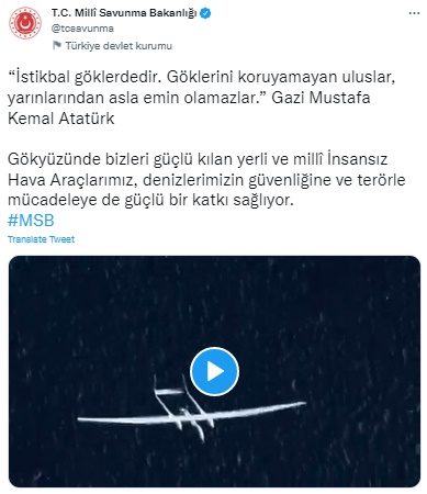 Milli Savunma Bakanlığı (MSB) tarafından yapılan videolu paylaşımda, "İstikbal göklerdedir. Göklerini koruyamayan uluslar, yarınlarından asla emin olamazlar. Gazi Mustafa Kemal Atatürk Gökyüzünde bizleri güçlü kılan yerli ve milli İnsansız Hava Araçlarımız, denizlerimizin güvenliğine ve terörle mücadeleye de güçlü bir katkı sağlıyor" ifadelerine yer verildi.